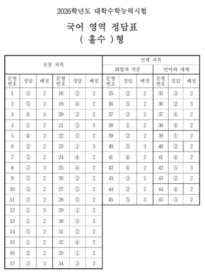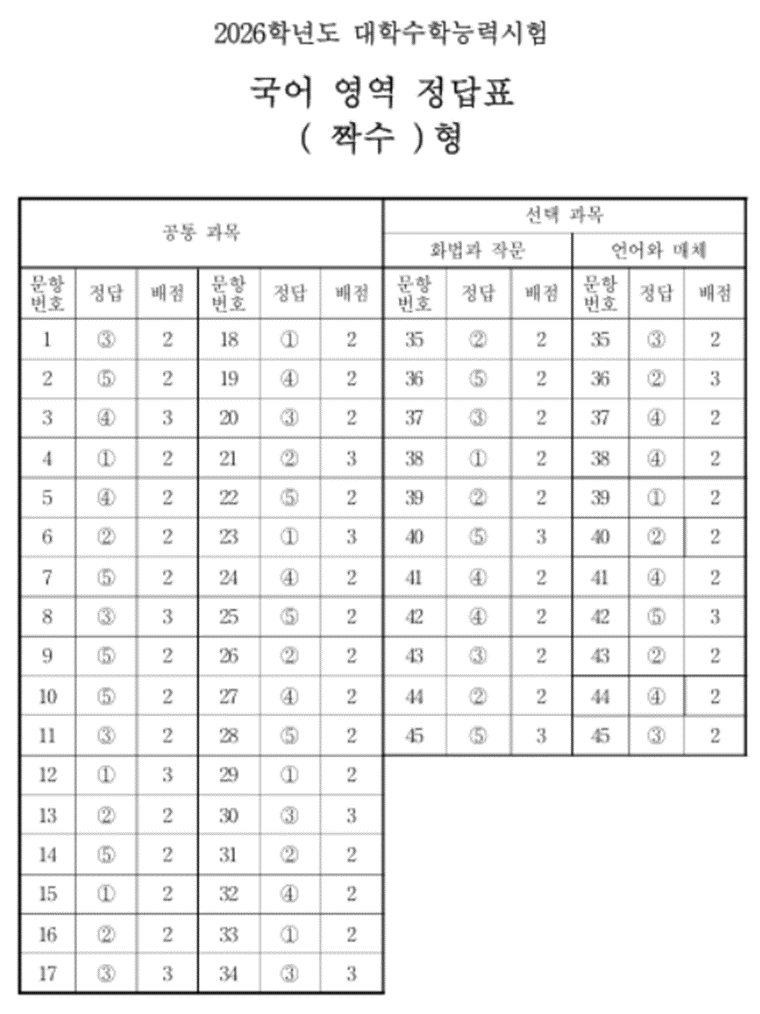2026 수능 국어 시험 답안지, 가채점 수능 국어 답지